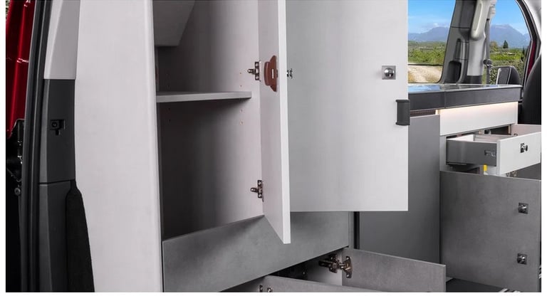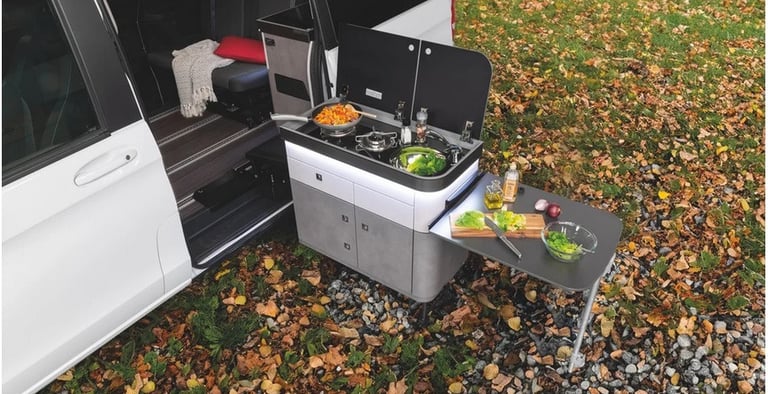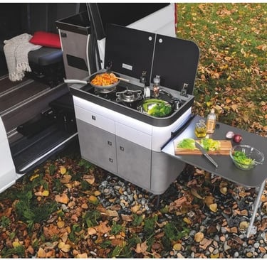 Punctul culminant incontestabil al CAMPSTAR este bucătăria sa Easy Move. Prin deschiderea ușii glisante de pe partea bucătăriei a vehiculului, bucătăria poate fi rotită spre exterior și așezată pe suprafață. Designul pivotant înseamnă că sunt necesare doar două mișcări ale mâinilor înainte de a putea începe să vă bucurați de o bucătărie în aer liber. Bucătăria Easy Move de înaltă calitate este dotată cu plite pe gaz, lavoar din oțel inoxidabil, capac rigid și facilități de depozitare. Ca să nu mai vorbim de: iluminarea ambientală