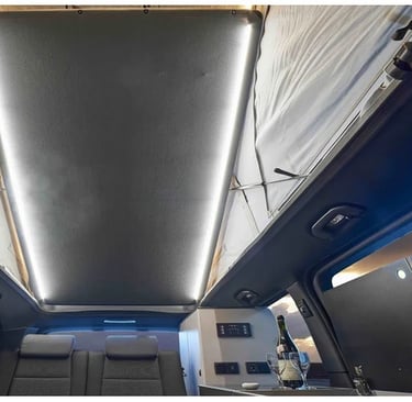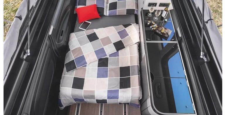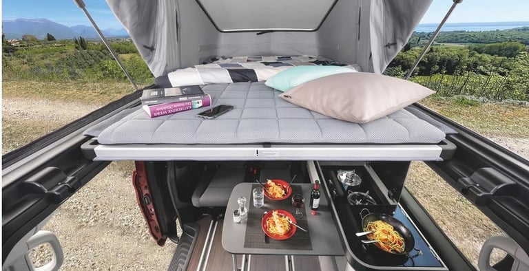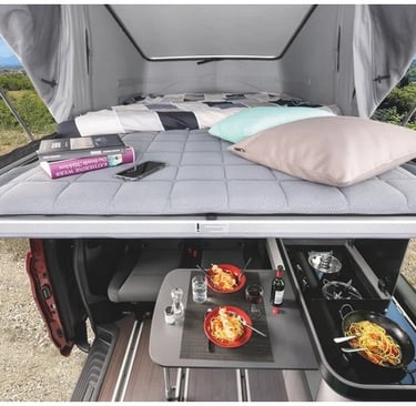 Veți dormi ca acasă în acoperișul nostru panoramic rabatabil WHOP: cu suprafața patului de 110 cm lățime, un cadru cu lamele și saltea extra groasă de 5 cm, aveți garantat un somn odihnitor. Funcția panoramă asigură un moment wow la culcare și din nou dimineața de confortul patului dumneavoastră. Pachetul de iluminare de serie oferă multă lumină de lucru jos și o atmosferă confortabilă sus - ambele sunt reglabile, desigur.