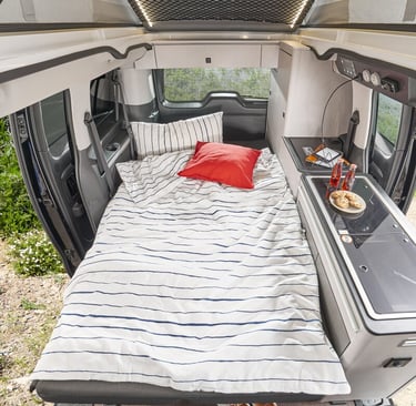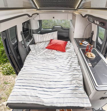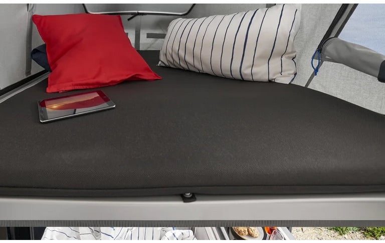 Fie că sunteți sus, în acoperișul ridicat, cu fereastră panoramică montată standard (dimensiuni pat 1.900 x 1.100 mm), fie jos. Așa de divin este să dormiți în CAMPSTER