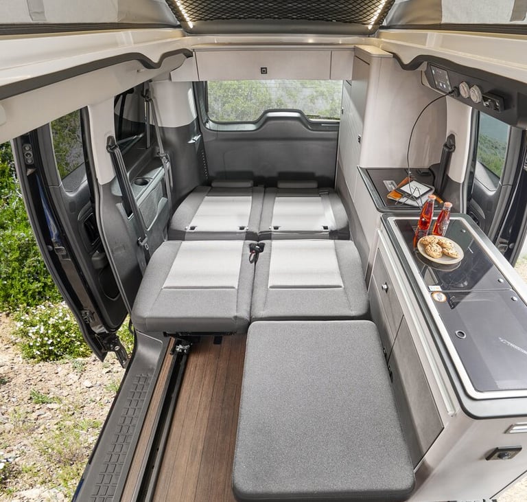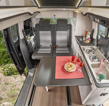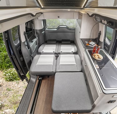 La fel ca VANSTERUL, CAMPSTERUL: La fel de variabil ca viața însăși. Dar, una peste alta, și mai adaptat pentru lumea largă. Îi răsfață cu adevărat pe cei aventuroși cu mobilierul și designul interior, fără a uita de cușeta din spate, disponibilă standard. Și datorită numeroaselor opțiuni, cum ar fi sistemul de încălzire auxiliară, lada frigorifică și multe altele, CAMPSTERUL poate fi transformat într-o autorulotă compactă, dar super confortabilă, gata pentru călătorii lungi.