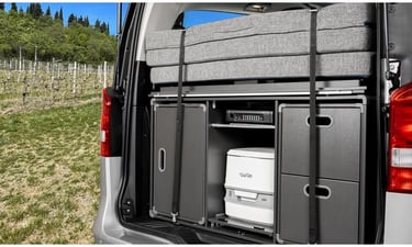 Plite cu 2 arzătoare și chiuvetă. Sistemul de cutii detașabile, ușor de introdus, transformă fiecare VANSTAR în rulota perfectă în cel mai scurt timp. Disponibil ca CAMPBOX KITCHEN & SLEEP cu saltea
