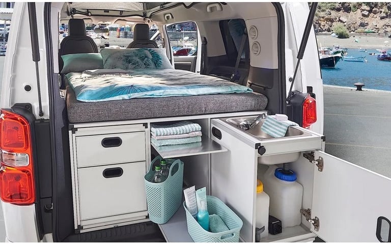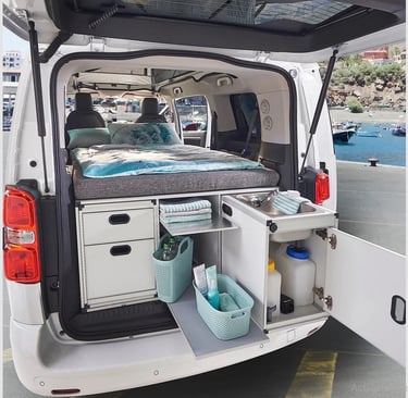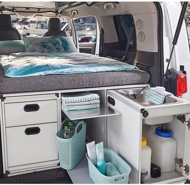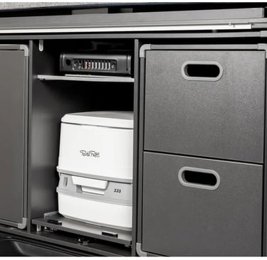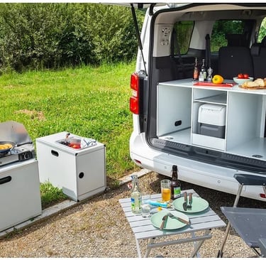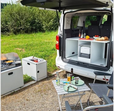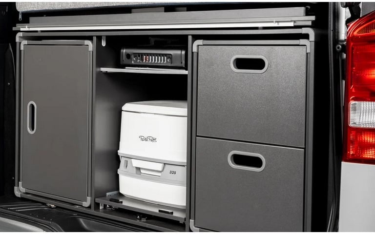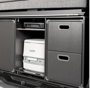 Capacitățile de călătorie ale VANSTER-ului tău sunt o decizie pe care o alegi doar tu. Proprietarii de VANSTER pot alege între două versiuni ale lăzii de camping, care pot fi introduse și scoase cu ușurință ori de câte ori este nevoie. Alege între modelul de ladă de camping Kitchen, cu soluțiile sale practice de depozitare, aragaz integrat cu 2 arzătoare și chiuvetă cu rezervor de apă dulce și apă uzată, sau modelul de ladă de camping Sleep. Aceasta dispune și de o extensie de pat, împreună cu o saltea confortabilă, pliabilă. Și toate acestea în două modele. Ambele soluții de ladă de camping sunt fabricate din materiale de înaltă calitate și lemn finisat CPL, ceea ce le face deosebit de ușoare și durabile. Sistemul de fixare rapidă permite introducerea și scoaterea foarte ușoară a lăzilor din interiorul vehiculului. Pe lângă faptul că oferă un spațiu de depozitare excelent, lada poate fi folosită și ca taburet.