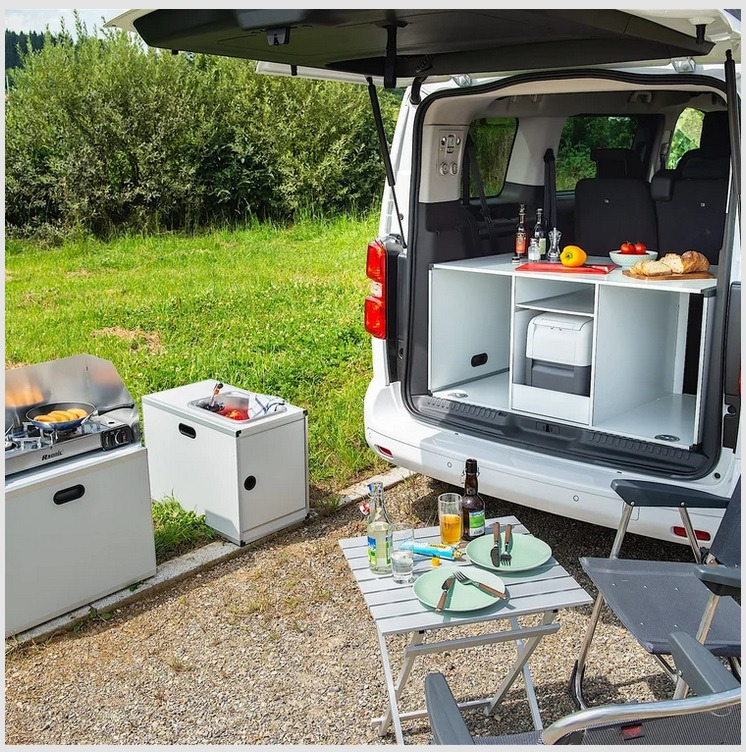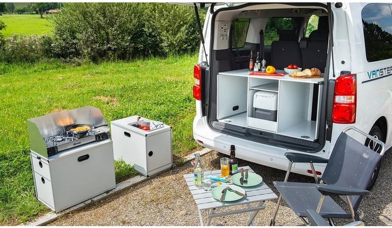 Vine cu elemente practice extensibile. Plite cu 2 arzătoare și chiuvetă. Sistemul de cutii ușor de introdus transferabil transformă fiecare VANSTER în autorulota perfectă în cel mai scurt timp.